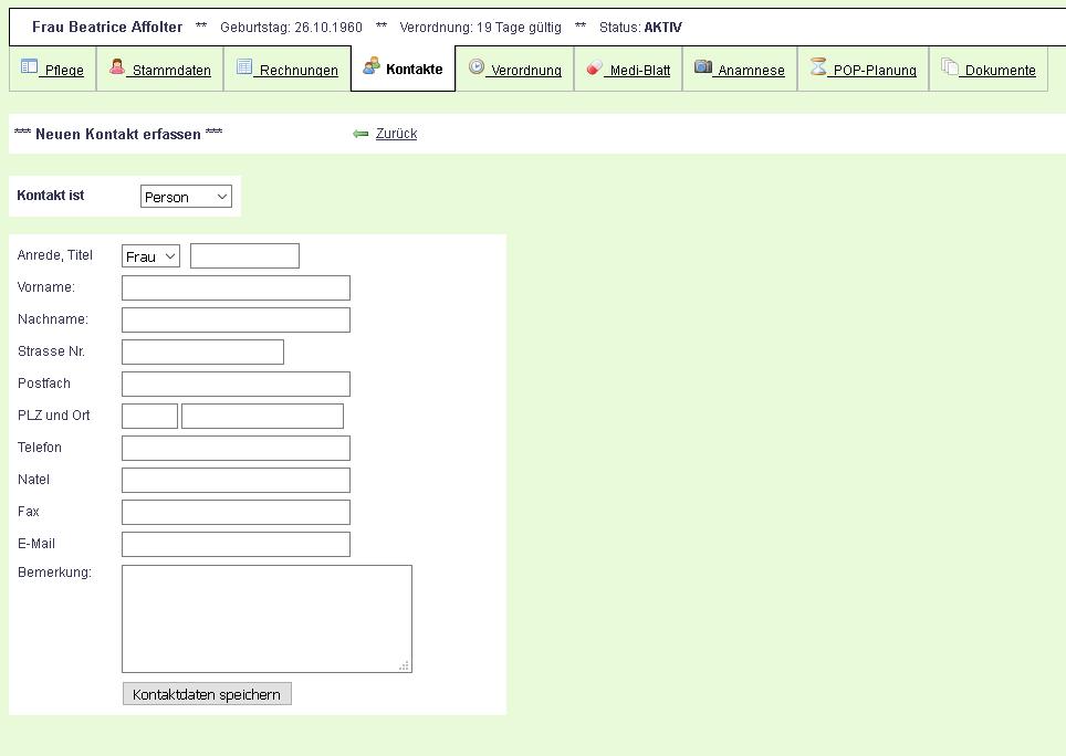 Über den Link im oberen Bereich kann dem Klienten ein neuer Kontakt zugeordnet werden. Das genaue Vorgehen wird nachfolgend beschrieben: