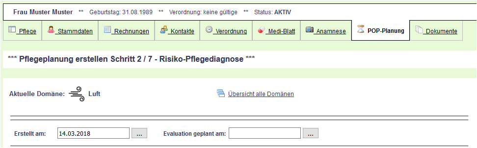Als aktuelle Domäne werden verschiedene Kategorien angezeigt. Luft, Wassser, Nahrung, Ausscheidung, Aktivität und Ruhe, Alleinsein und soziale Interaktion, Abwendung von Gefahren, Integrität der Person und Soziales Umfeld.