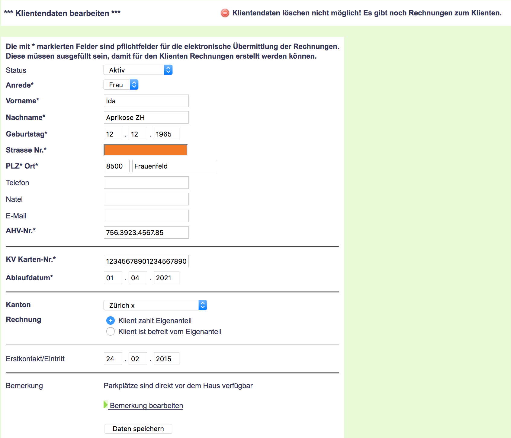 Die AHV-Nummer ist ein Pflichtfeld bei der ☞ elektronischen Rechnungsübermittlung nach den Vorgaben von eKarus. Sie wird ebenfalls benötigt, wenn Daten bei der Clearingstelle eingereicht werden oder der Rechnungsexport für Stadt Zürich oder Stadt Luzern genutzt wird.
