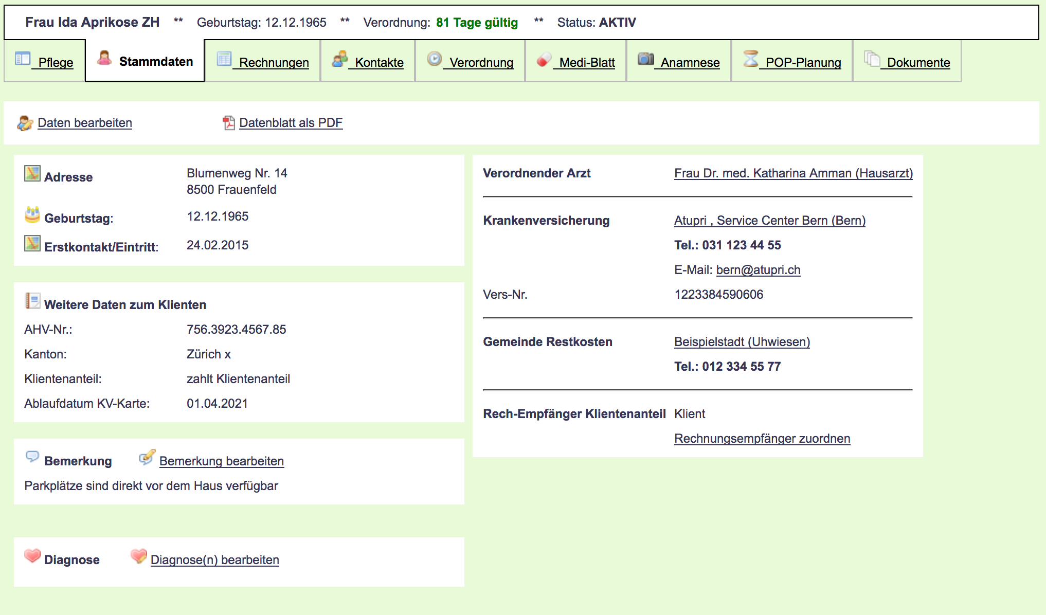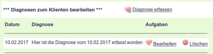 Es handelt sich ausschliesslich um ein Information zum Klienten. Erfasste Diagnosen haben keine Einfluss auf andere Bereiche der Applikation.