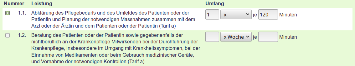 1. Die benötigte Leistung wird durch Markieren des Kästchens vor der Nummer grundsätzlich für die Verordnung ausgewählt.