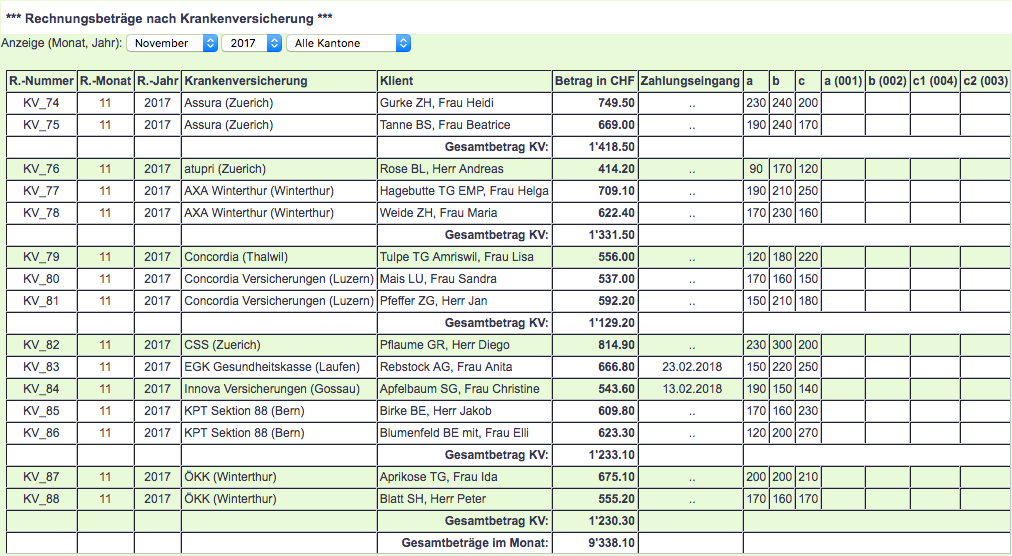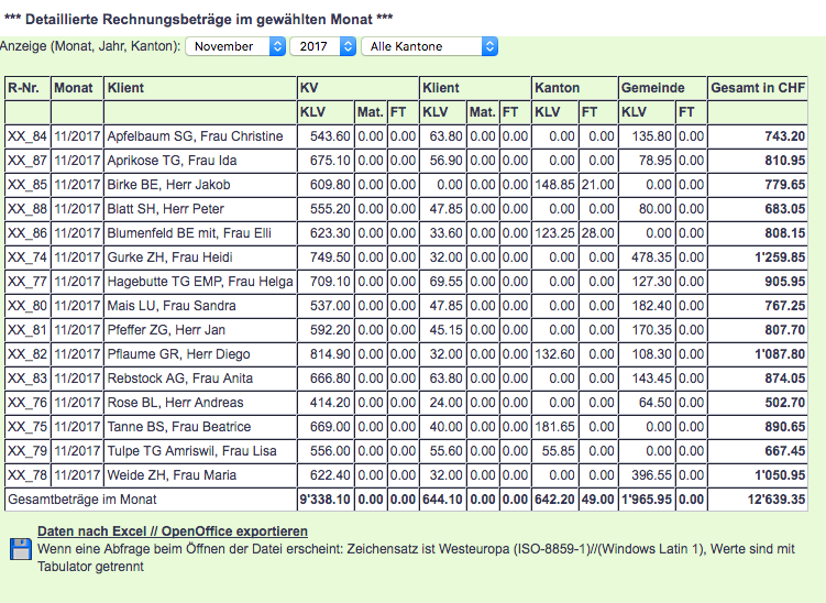 Alle Rechnungen pro Klient, die während eines Monats erstellt wurden, sind hier zusammengefasst dargestellt. Es werden die Totale der Krankvensicherungsbeträge, Klientenanteile, Restkostenfinanzierung des Kantons und der Gemeinden.