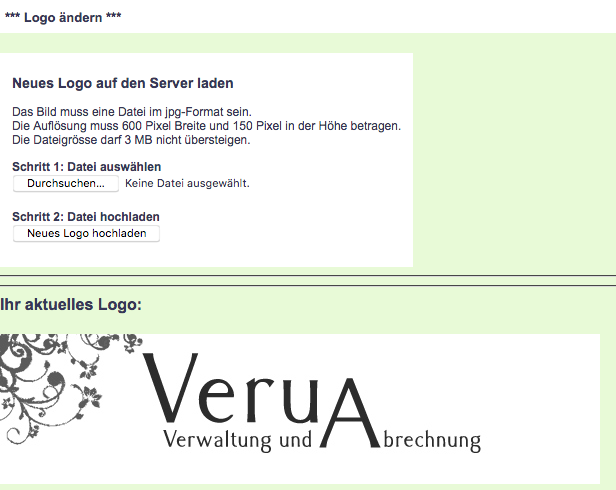 Standardmässig ist in VeruA unser Logo eingebettet. Es ist aber jederzeit möglich, dieses Logo zu ersetzen mit einem individuellen Bild oder Text. Es müssen aber die Grösse und das Format des Bildes mit den Systemvorgaben übereinstimmen: