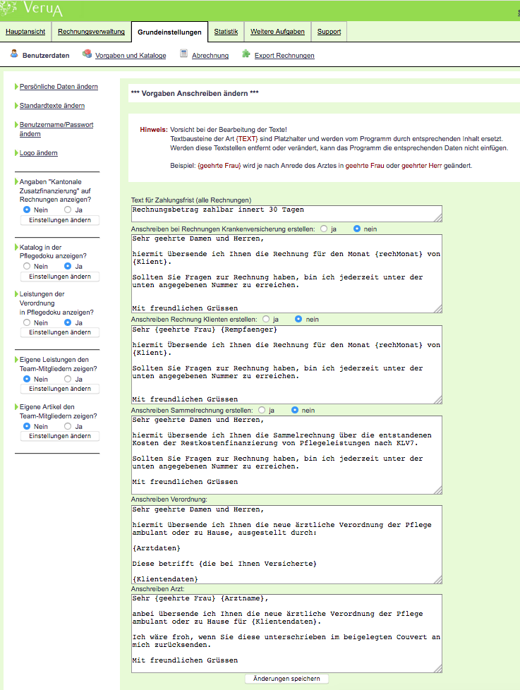 In der Applikation VeruA •• Verwaltung und Abrechnung sind Standardtexte für Begleitbriefe beim Rechnungs- und Verordnungsversand hinterlegt.