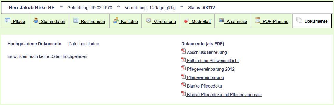 In diesem Bereich können Dokumente abgelegt werden, wie z.B. genehmigte Verordnungen, unterschriebene Pflegevereinbarung, usw. Auch sind bereits nützliche Vorlagen als Standard in VeruA gespeichert.