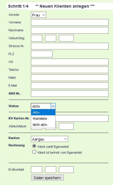 Da gibt es das Feld „Status“: Hier kann definiert werden, ob ein neuer Klient bereits als Patient („Aktiv“) oder erst noch in die Warteliste aufgenommen werden soll.