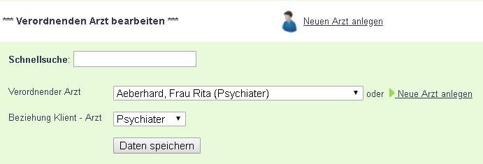 Im Feld Schnellsuche kann der erste Buchstabe des Nachnamens des Arztes eingegeben werden. Falls er bereits erfasst wurde, wird er erscheinen als Suchergebnis und kann ausgewählt werden.