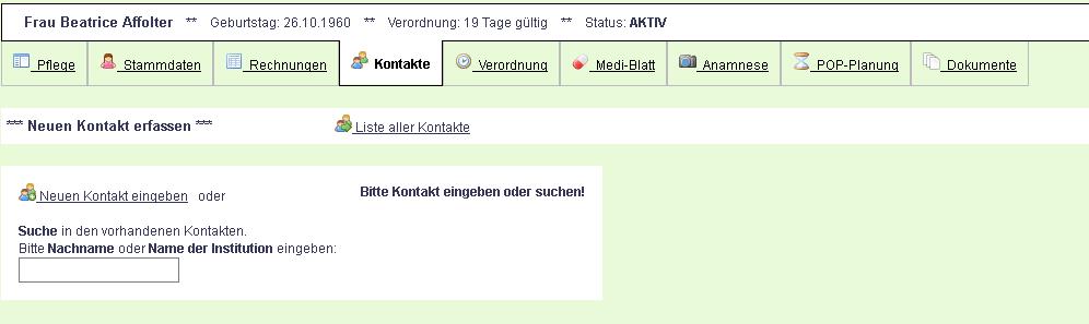 Über den Link im oberen Bereich kann dem Klienten ein neuer Kontakt zugeordnet werden. Das genaue Vorgehen wird nachfolgend beschrieben: