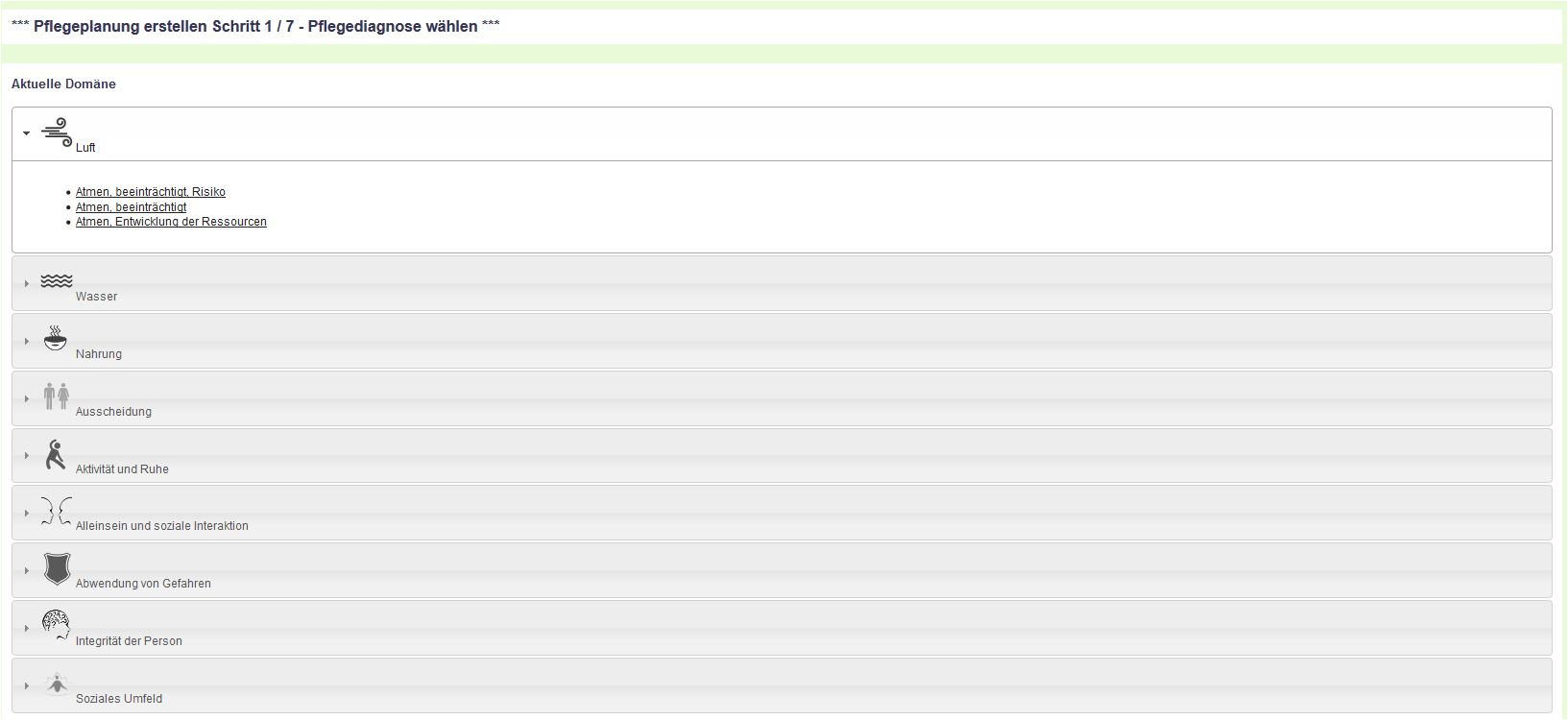 Als aktuelle Domäne werden verschiedene Kategorien angezeigt. Luft, Wassser, Nahrung, Ausscheidung, Aktivität und Ruhe, Alleinsein und soziale Interaktion, Abwendung von Gefahren, Integrität der Person und Soziales Umfeld.