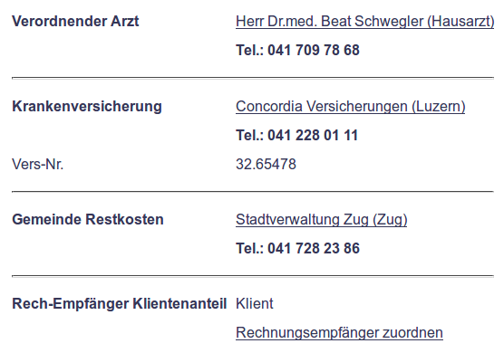 Krankenpflege-Leistungsverordnung (KLV) Artikel 8 In diesem Bereich wird der verordnende Arzt angezeigt. Seine Adresse usw. kann unter „Weitere Aufgaben“ - „Arztdaten bearbeiten“ verändert und angepasst werden. Es ist notwendig, dass die ZSR und GLN/EAN Nr. des Arztes eingetragen ist.