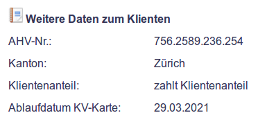 Die AHV-Nummer ist ein Pflichtfeld bei der ☞ elektronischen Rechnungsübermittlung nach den Vorgaben von eKarus. Sie wird ebenfalls benötigt, wenn Daten bei der Clearingstelle eingereicht werden oder der Rechnungsexport für Stadt Zürich oder Stadt Luzern genutzt wird.